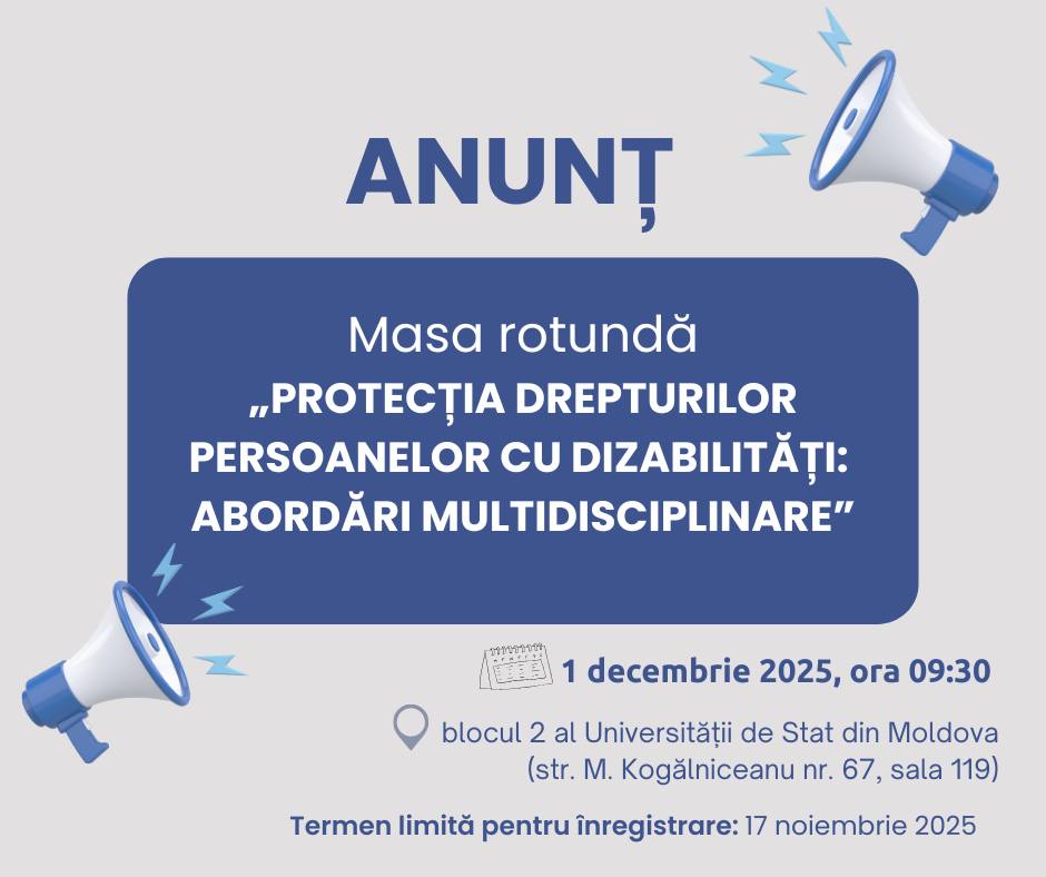 Organizația noastră, în parteneriat cu Universitatea de Stat din Moldova (Departamentul Drept Privat, Departamentul Sociologie și Asistență Socială și Departamentul Drept Public) și Ministerul Muncii și Protecţiei Sociale al Republicii Moldova, organizează, la data de 1 decembrie 2025, masa rotundă „𝐏𝐫𝐨𝐭𝐞𝐜ț𝐢𝐚 𝐝𝐫𝐞𝐩𝐭𝐮𝐫𝐢𝐥𝐨𝐫 𝐩𝐞𝐫𝐬𝐨𝐚𝐧𝐞𝐥𝐨𝐫 𝐜𝐮 𝐝𝐢𝐳𝐚𝐛𝐢𝐥𝐢𝐭ăț𝐢: 𝐚𝐛𝐨𝐫𝐝ă𝐫𝐢 𝐦𝐮𝐥𝐭𝐢𝐝𝐢𝐬𝐜𝐢𝐩𝐥𝐢𝐧𝐚𝐫𝐞”. Evenimentul își propune să reunească cercetători, practicieni și activiști în domeniul protecției drepturilor persoanelor...
